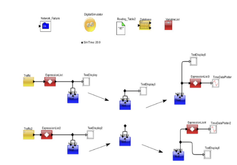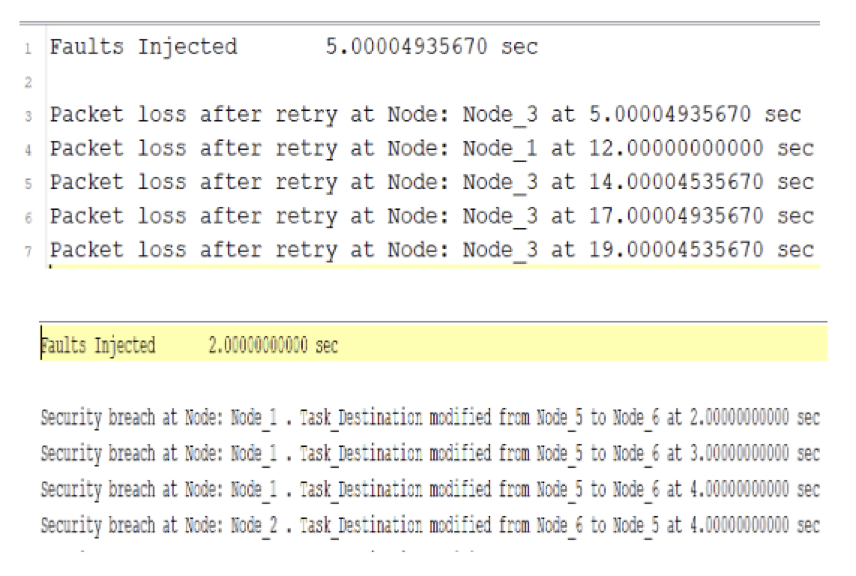 In Fig.10, node1 (sender) and node2 (sender) sends the data packets to the node3 (hop) and node4 (hop) which forward it to the node5 (receiver) and node6 (receiver). The network_failure module injects the failure in the model to analyze different variations that occurs dynamically during the simulation run. In Fig. 11, two failures; message loss and message incorrect addressing are shown.