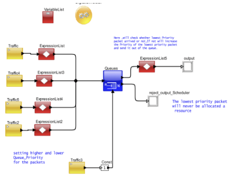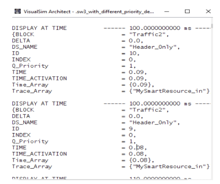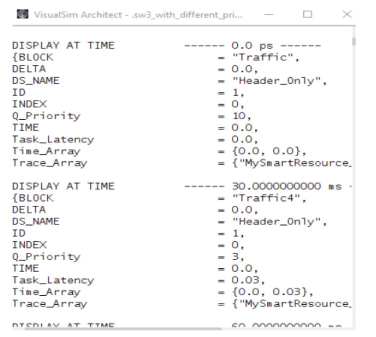 In Fig.4, packets (tasks) generated from four traffic blocks are sent to the Queue from which tasks are loaded into ECU for processing. The ECU takes the higher priority packets from the Queue and when more tasks come in and if Queue is full, then the Queue rejects lower priority packets. In Fig.5, there is the output from the Queue with higher priority tasks allocated to the ECU, and in Fig.6, there is the output from the queue rejecting lower priority tasks. Over time, the priority of the lower priority packet is increased, and it gets the ECU resources.