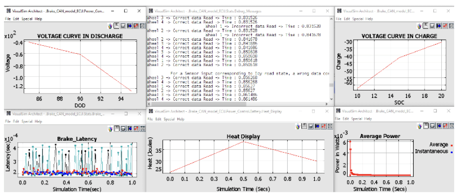 In Fig. 17, it depicts different latency from all the four wheels, the average power consumed by the ECU for processing the data along with the charge, discharge voltage curve, and the heat display shown during the simulation run. The text display outputs the correct and incorrect values read by the wheels at different simulation runs.