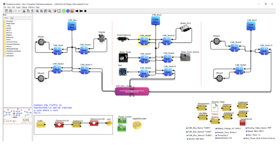 The model represents a miniature of a car braking system, which contains four wheels, proximity sensor, gyro sensor, engine, break engine control unit (ECU), brake pedal, road condition sensor, and can bus network connected via CAN_ether_switch.