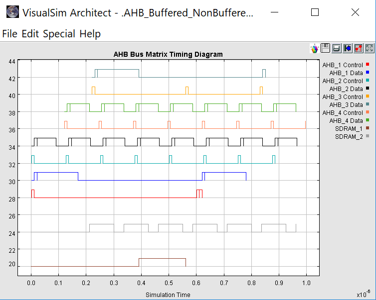 The model, containing the AHB/APB can accept an Excel spreadsheet to define the traffic sequences. Some of the key features of VisualSim AMBA AHB model are as follows: