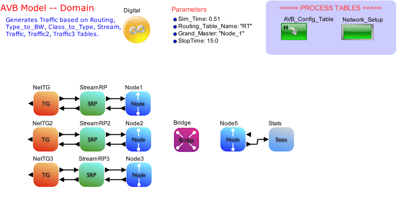- AVB_Config_Table: This block contains examples of the required tables, setup blocks and the memory blocks for the AVB modelling environment