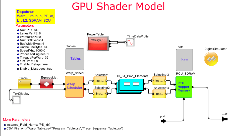VisualSim has created a GPU template that allows the user to try different configurations of threads, warps, shader cores, special instructions, memory access, caching and dispatcher. The model is connected to the processor sub-system and also to interfaces for data input/output. The model has four files that define the software behavior. These enable software, functions, memory accesses, special instructions, threads and masks.