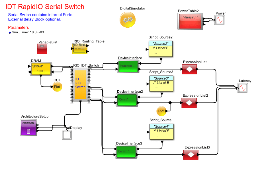 - Complete systems using RIO network can be constructed with other VisualSim libraries such as processors from TI and Freescale, memories, storage devices, buses such as PCI, PCIe, networking devices such as Ethernet and Fiber Channel, statistical traffic generators and FPGA boards.