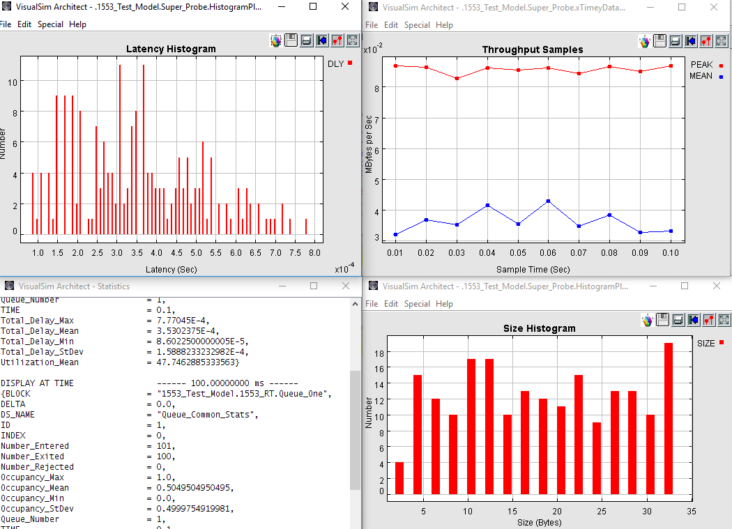 VisualSim 1553B library provides extensive statistics including End-to-end latency, 1553B Bus Latency Histogram, Packet Histogram, 1553B Bus Throughput, Rejects plot, Datalink Statistics and 1553B Bus Statistics for buffer occupancy and waiting time at the RT, and the utilization of the 1553B bus controller.