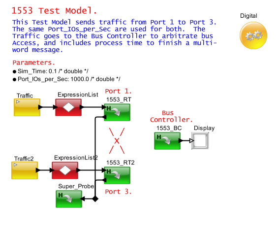 VisualSim 1553B library provides the only industrial simulation of this Standard. Using this library, users can identify performance bottlenecks in the software execution, data loss issues and network topology errors. The protocol can be combined with hardware architecture blocks to define the behaviour of the Remote Terminals.