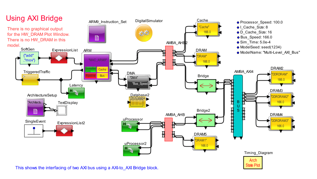 This library provides a system-level modelling implementation of the AMBA 2 and the updated AMBA 3 specification from ARM. This library supports the AHB, AHB-lite, multi-layer AHB and APB. The blocks are completely flexible and can be configured for almost any topology. The blocks can be connected to hardware components, accelerators or custom-programmed blocks- SystemC or using the VisualSim graphical environment. Using these components, the user can assemble, configure, simulate, debug and analyse the power consumption and performance of the next-generation SoC. The performance attributes and the various power modes of the AHB/APB embedded in the library block. The library contains a number of traffic models that have been pre-built and parameterized to simulate dynamic system operations.