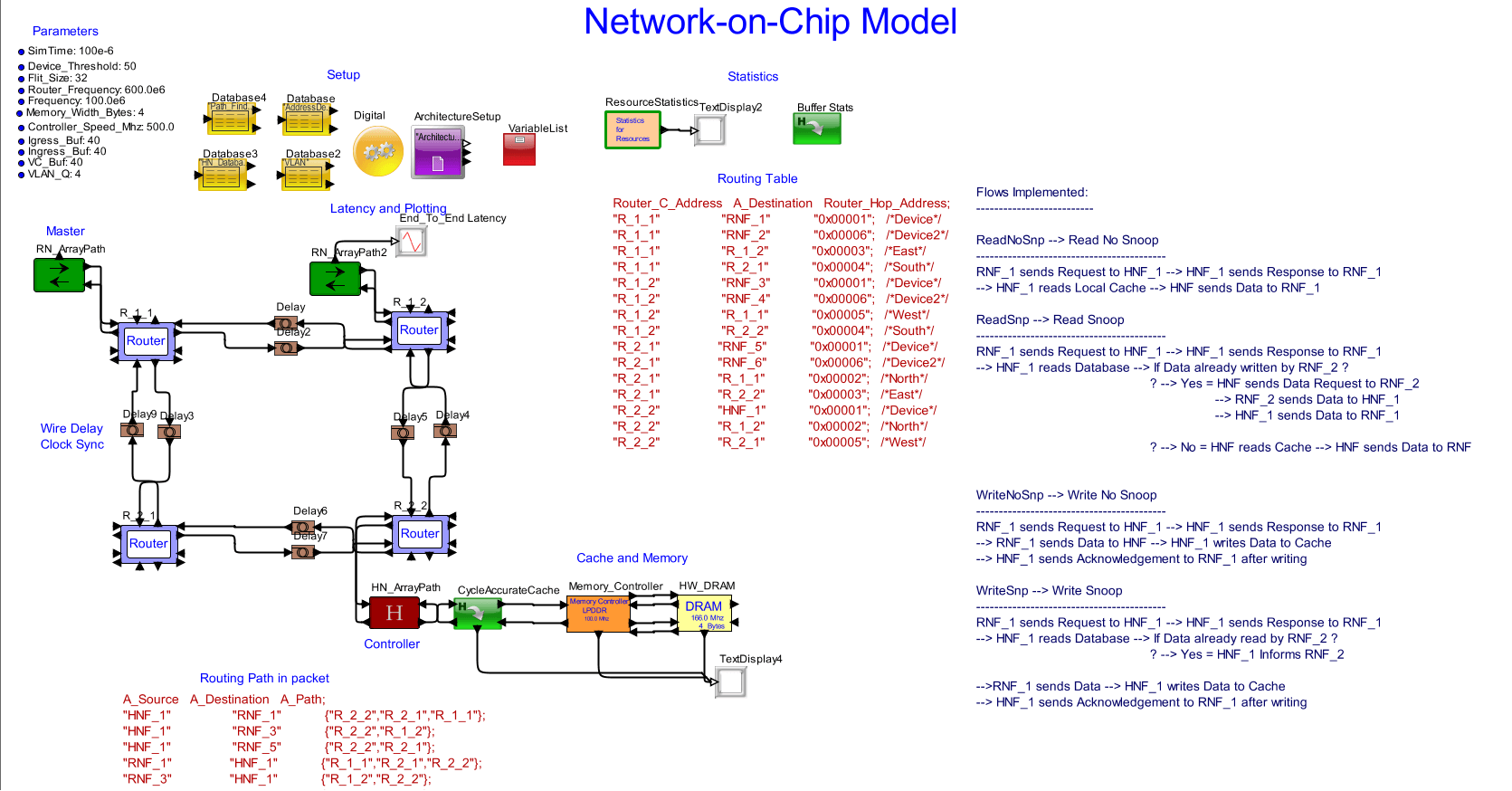 The CMN600 model uses the baseline NoC library shipped with VisualSim Architect. This library models the routing, unique crossbar for each type of traffic- Request, Response, Data, and Snoop. There is a virtual channel support on the Egress port. All the standard Request Nodes, Slave Nodes, Bridges and Home Nodes are supported. The Snooping protocol is implemented and the XP can connect to AXI buses, Memory controllers and other Slaves.