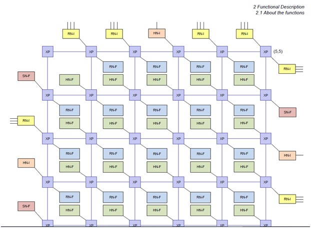 Router is a called XP or CrossPoint. The Router support two devices per node and four network connections. The flows are based on message type and Quality of Service.