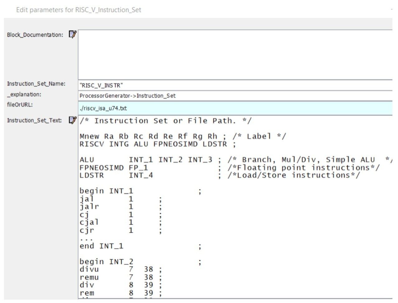 Fig. 9 shows how the 8 stages of the pipeline are set up and how the processor parameters are set up – Processor clock speed, instructions per cycle, outstanding load-store access count etc. We then used the Instruction_Set library module provided by the VisualSim Architect to define the RISC-V ISA. Fig. 10 shows how the Instruction_Set module has been set up – Number of Execution Units, instructions per execution units, instruction latency etc. are set up here.