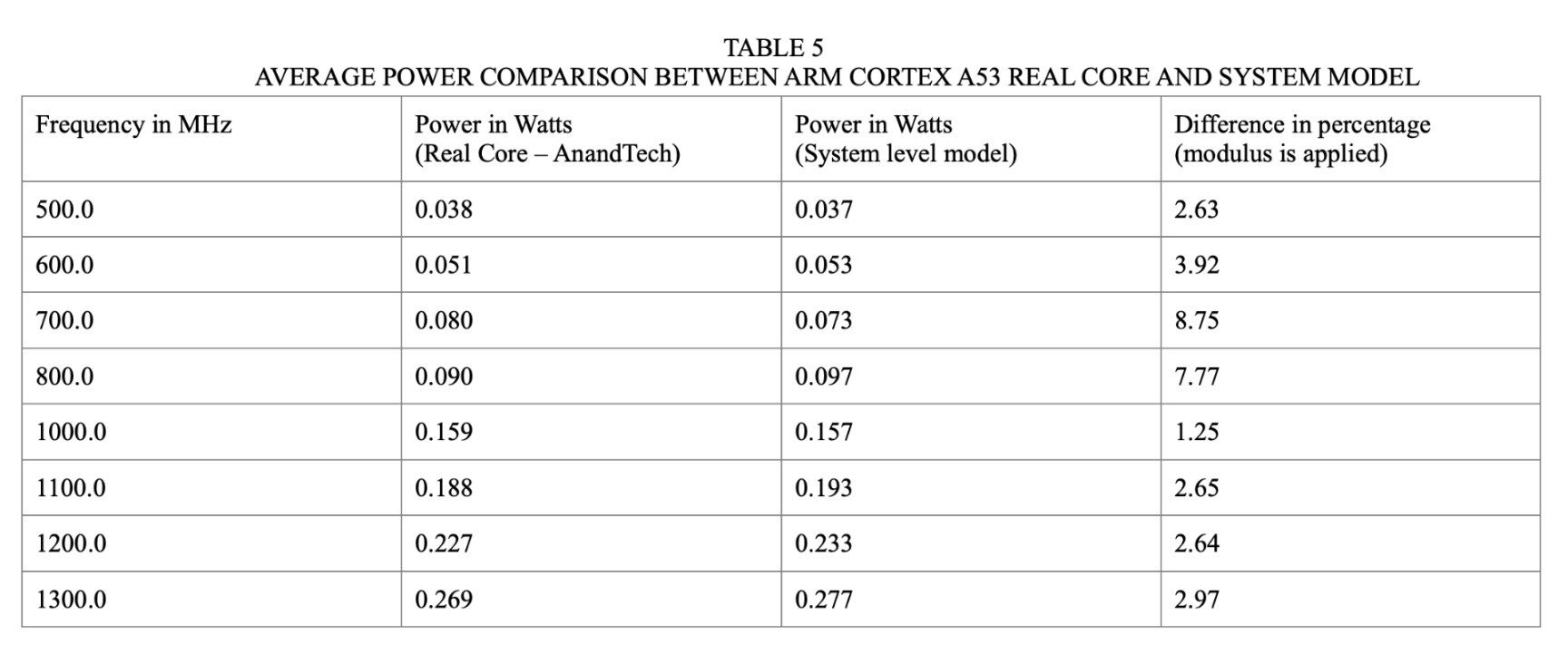 The simulation was run for different clock frequency and the average power observed was recorded and compared against the real A53 core. The comparison result is shown in the table below.