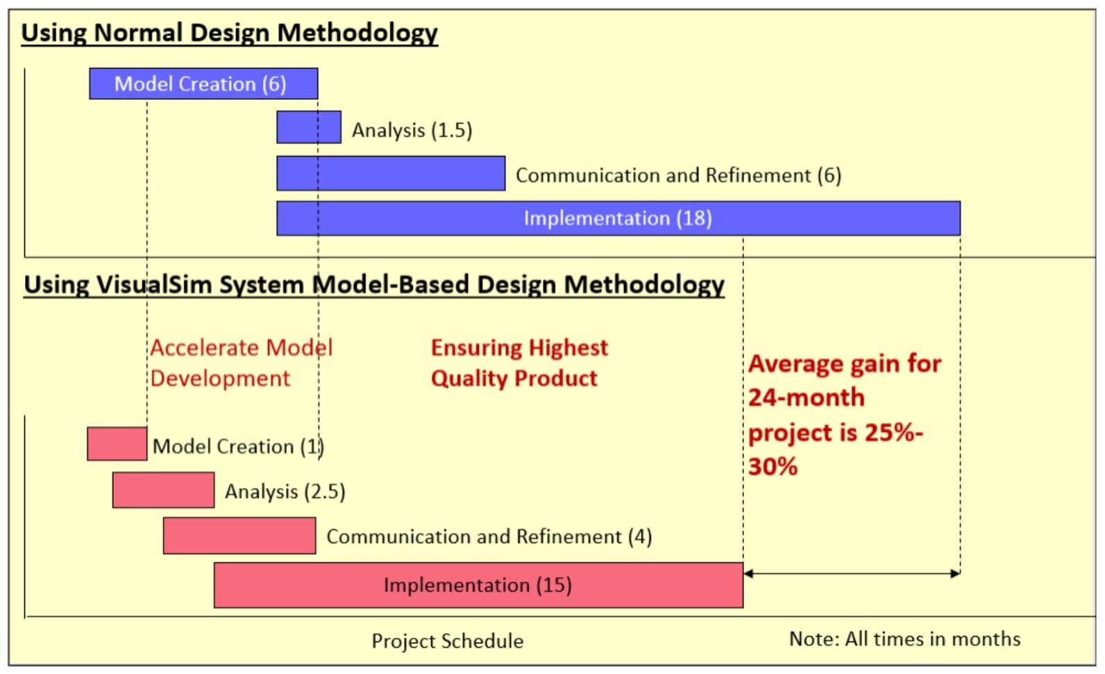 The proposed methodology for comparing processor cores or different configurations of the same core using system level modelling was proven to be a success. We observed that the system level model achieved 90%-99% accuracy when compared with the real board – both power and performance. Architects could now use the system model to evaluate the application on the target architecture and analyze the performance and power metrics to decide whether to go forward with their proposed design or if changes are required to meet the requirements. Since it can be done very early in the design process, a lot of time and resources can be saved. We compared the amount of time it took to meet the design requirements with and without system modelling and the comparison result can be seen below in Fig. 22.