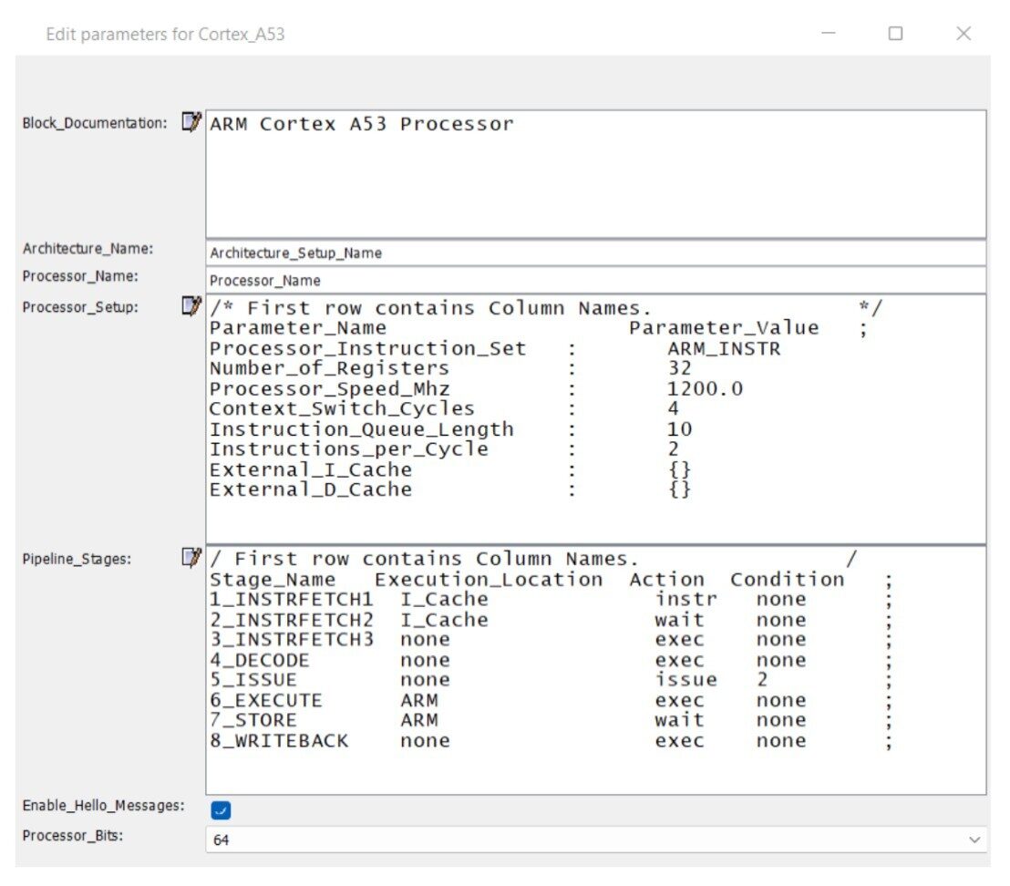 The focus will be on modeling single core of Cortex A53 and once validated, scaled up to multi-core design. The Cortex A53 is a dual issue, in-order Processor in that instructions issue, execute, and commit in order with 8 pipeline stages. The pipeline consists of three sections for instruction fetch, instruction decode, and execute.
