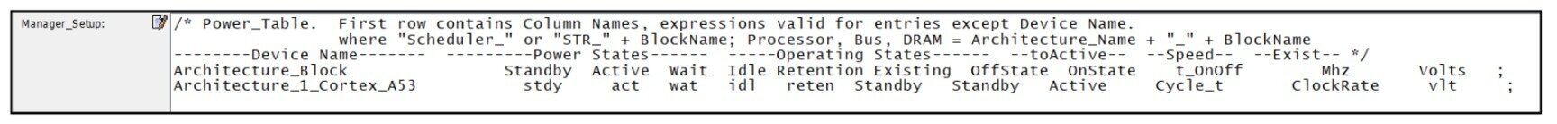 Now that the performance accuracy has been taken care of, we went ahead to add power modelling to the A53 System model. For this purpose, we made use of the PowerTable plugin provided with the power modelling suite in VisualSim Architect. The PowerTable has provisions to accept the power per state per device. So we were able to enter the Active, Standby, Wait, Idle and Retention power values as shown below, Fig. 14.