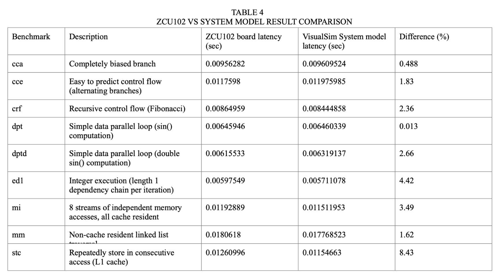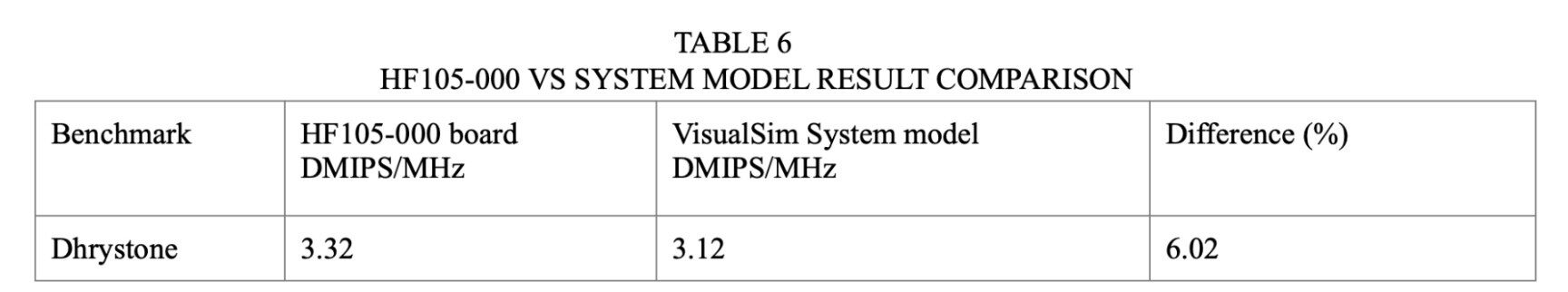 Similarly, the SiFive U74 system model was also validated. We used the Dhrystone benchmark for comparing the accuracy between the SiFive U74 core in HF105-000 board [14] and the system model. The obtained result is shown below in Table 6.