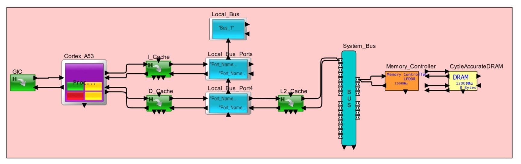 The Model layout of ARM Cortex A53 built using VisualSim Architect is shown below, Fig 4.