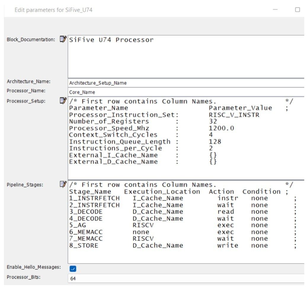 The U74 system model has been built using the Hybrid Processor modeling suite. We made use of cycle-accurate cache, TileLink and DDR plugins available in the tool librabry and thus made the process of assembling the system model easy. The Processor architecture – pipeline stages, settings were mapped to the system model with the help of parameters provided by the Hybrid Processor, as shown below in Fig. 9.
