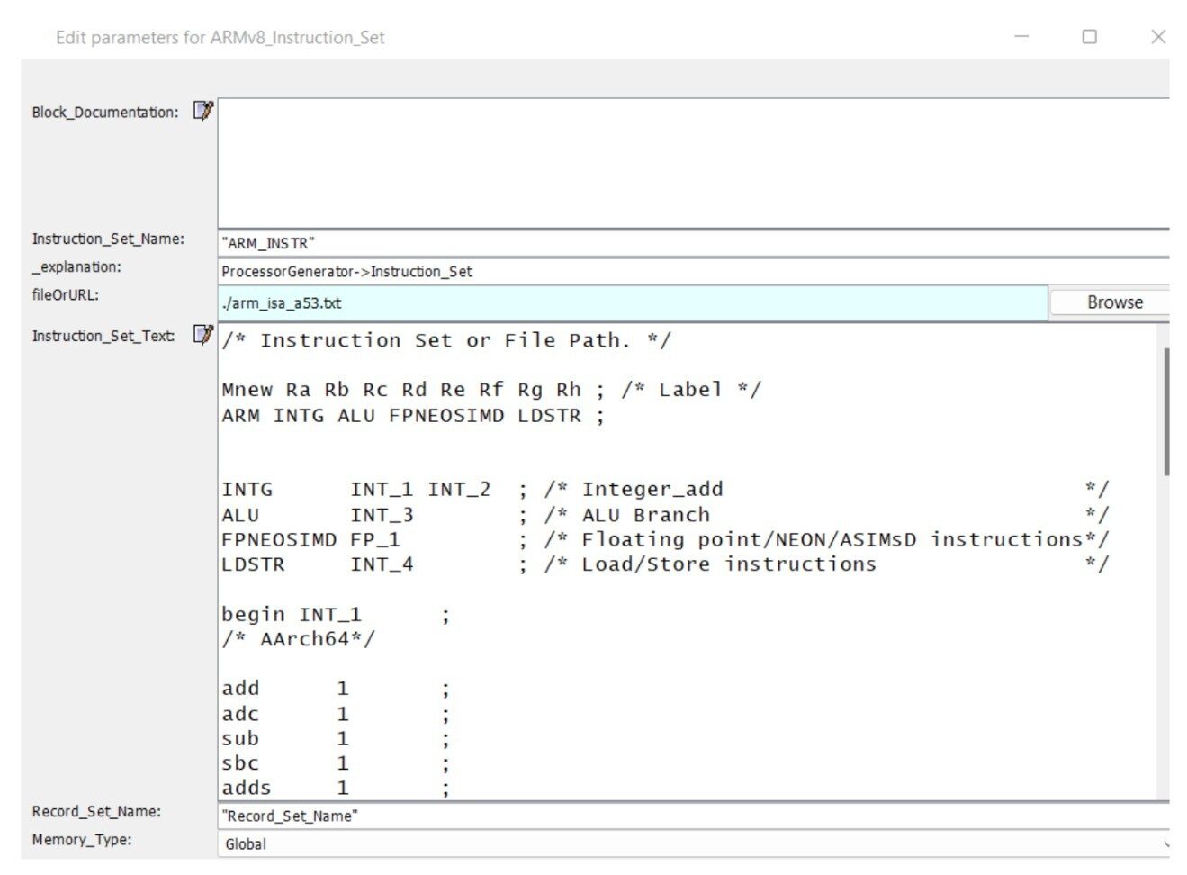 Fig. 5 shows how the 8 stages of the pipeline are set up and how the processor parameters are setup – processor clock speed, instructions per cycle, number of registers etc. We then used the Instruction_Set library module provided by the VisualSim Architect to define the ARM ISA. Fig. 6 shows how the Instruction_Set module has been setup – number of execution units, instructions per execution units, instruction latency etc. are setup here.