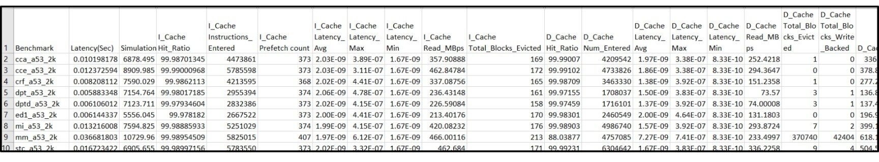 Once the simulation was done, the tool printed out the stats across all cache levels, buses and memory into a csv file which made it easy to analyze the stats. The generated stats are shown below, Fig. 12