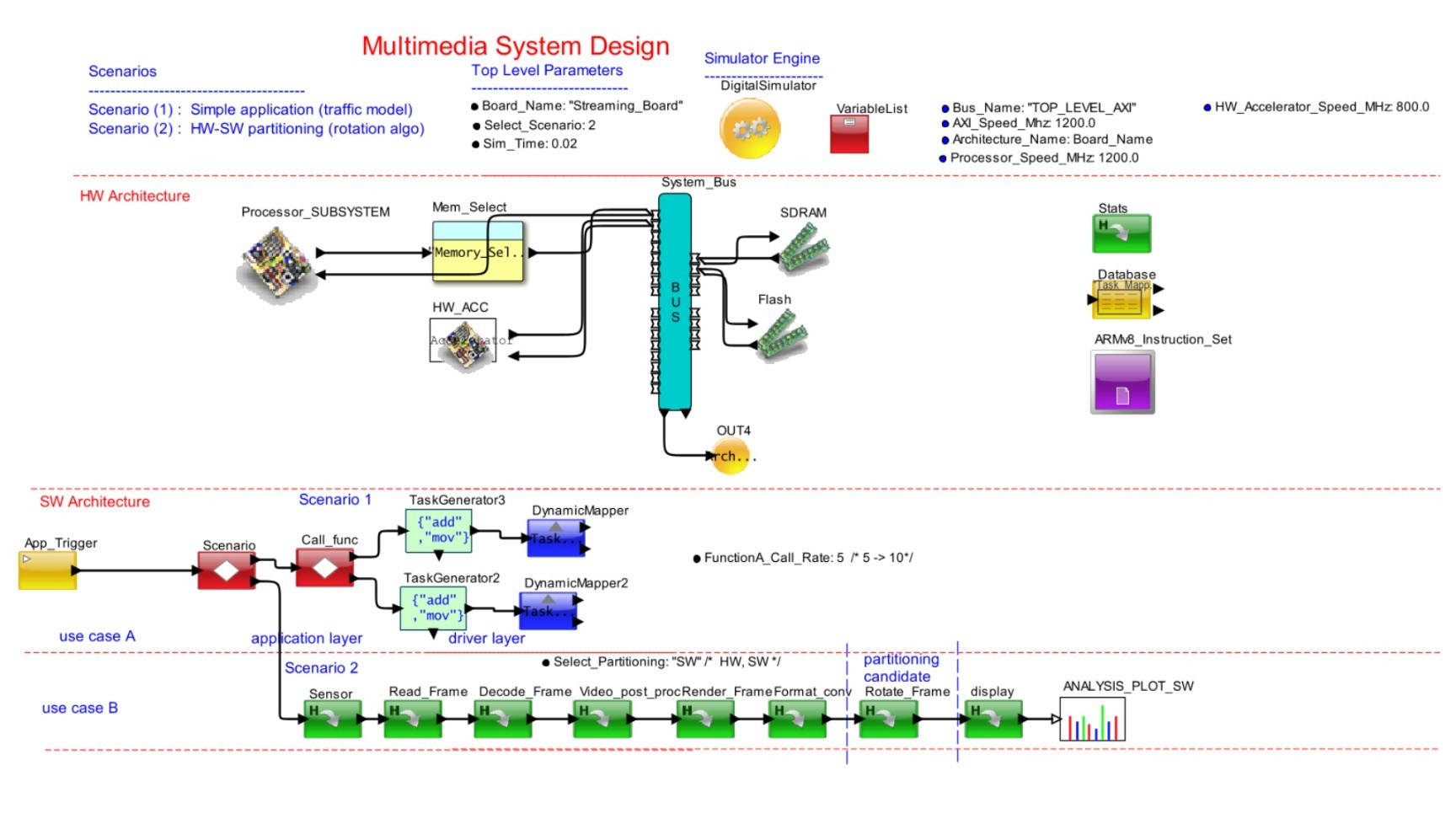 Fig.17 shows the Software architecture (at the bottom) as well as the Hardware Architecture (at the top). The Processor_SUBSYSTEM block within the Hardware Architecture contains the processor system model – ARM Cortex A53 or the SiFive U74. The simulation was run using the ARM and RISC-V core and the results were recorded.