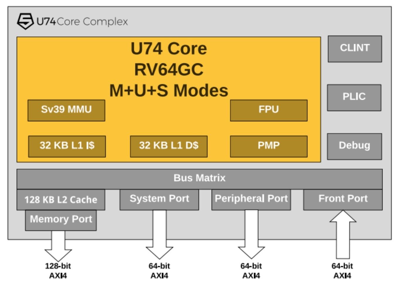 The U74 Core Complex includes a 64-bit U7 RISC‑V core, which has a dual-issue, in-order execution pipeline, with a peak execution rate of two instructions per clock cycle. The U7 core supports machine, supervisor, and user privilege modes, as well as standard Multiply (M), Single Precision Floating Point (F), Double-Precision Floating Point (D), Atomic (A), Compressed (C), and Bit Manipulation (B) RISC‑V extensions (RV64GCB). It supports TileLink interconnect standard.