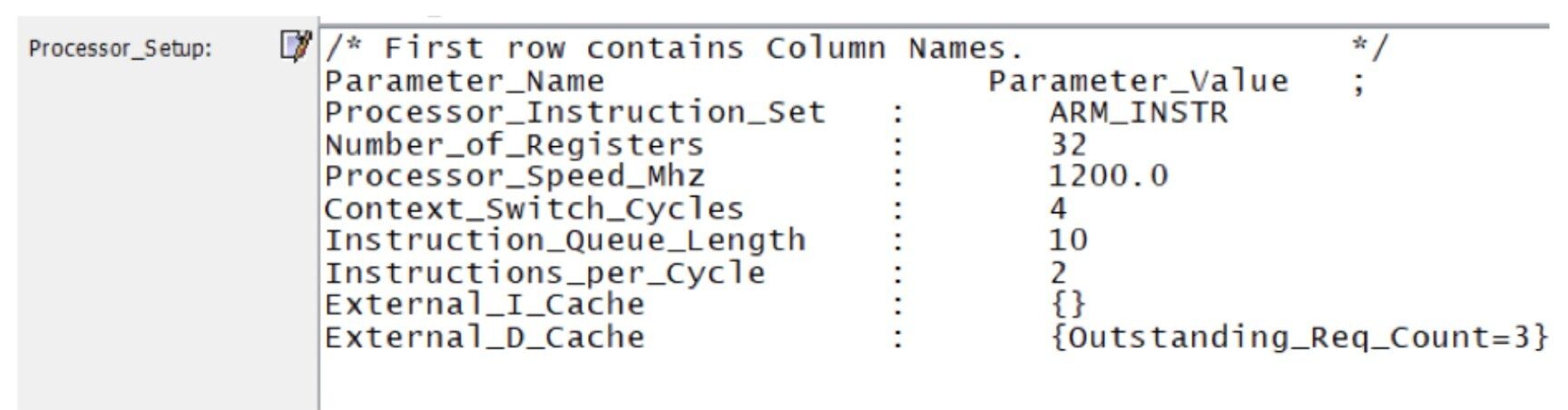 While the majority of the benchmarks performed within the range of 90% – 99%, there were a few which performed poorly – mm and stc (Table 3). To debug the cause for such a huge delta, we utilize the Insight_Engine provided by the VisualSim Architect along with the PostProcessor batch mode simulation. The batch mode simulation made it possible to run multiple parameter variations in parallel on different cores and the Insight_Engine swept across each module used in the system model thereby keeping track of every activity happening across them. A Trace was generated at the end of the simulation which gave us information on the time consumed by each instruction across different stages of the pipeline. Using this information and comparing it with the details from ARM Technical reference guide, we were able to find that a parameter responsible for controlling the outstanding Data Cache accesses from the load store unit was not set. So the required parameter was added at the Hybrid Processor as shown below in Fig 13.