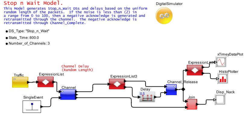 The Channel blocks provide the infrastructure to extend the ability of the Queue and Server. The Queue holds the transaction and sends it on the channel when the channel becomes free. The transaction can go through a sequence or delays, resource consumption, logic and a decision on success or retry. The retry can force the packet to go back into the queue and resent. Here the implementation details can be logic plus delay. Example use of the reject are noise (communication channel) and buffer overflow (memory).