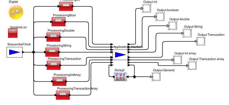 The Application_Interface block is used to import any application and C/C++ directly into VisualSim for use in a model. Once the block has been configured and compiled, it can connect to any other block in the Block Diagram Editor. The CustomC block can accept data arriving on any port, inspect the content and determine the next operation. The block can also send data to the block output port at any time independent of data arriving at the input. The user can add any number of input and output ports. There are no restriction on the port names. The block can have user-defined parameters that can be accessed by the code. The module name must be unique for each code variation in the model as the wrapper generator will create a unique directory with that name in the CustomC directory. Multiple instances of the same block can exist in the model. The Application_Interface block is a non-blocking block. This means that while this block executes the rest of the VisualSim model will also continue to execute. There are specific C++ functions available that can stop and start the blocking of the simulator. This must be added to the .h and the .cpp files.