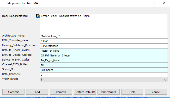 - The DMA block includes parameters such as DMA to Device and Device to DMA cycles, DMA to Device address, DMA Speed, DMA Channels, Word width, and Channel FIFO buffer size.