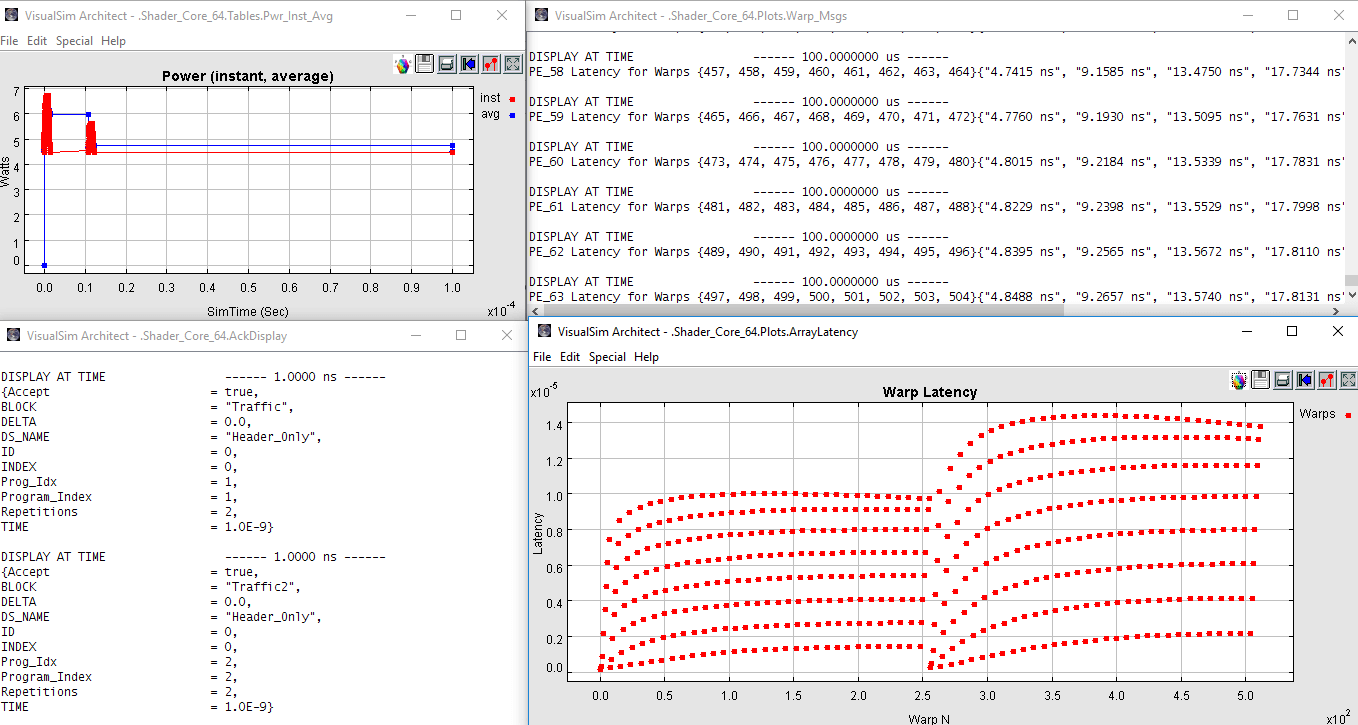 VisualSim has created a GPU template that allows the user to try different configurations of threads, warps, shader cores, special instructions, memory access, caching and dispatcher. The model is connected to the processor sub-system and also to interfaces for data input/output. The model has four files that define the software behavior. These enable software, functions, memory accesses, special instructions, threads and masks.