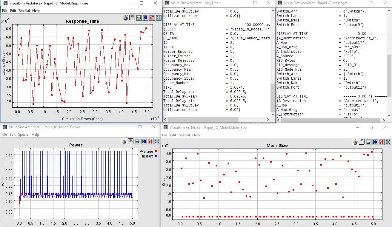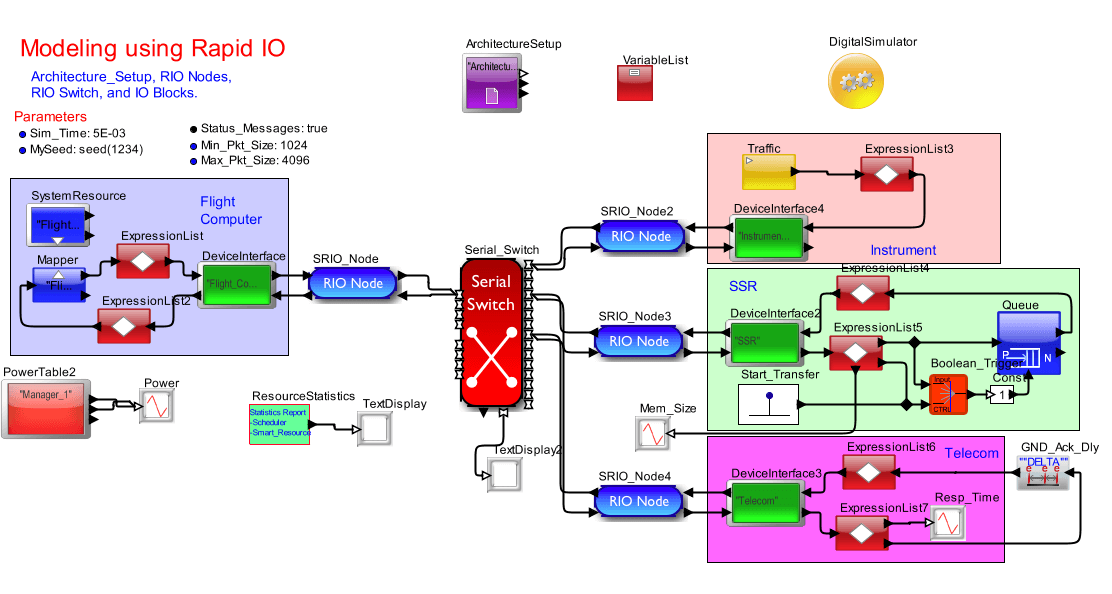 - Complete systems using RIO network can be constructed with other VisualSim libraries such as processors from TI and Freescale, memories, storage devices, buses such as PCI, PCIe, networking devices such as Ethernet and Fiber Channel, statistical traffic generators and FPGA boards.