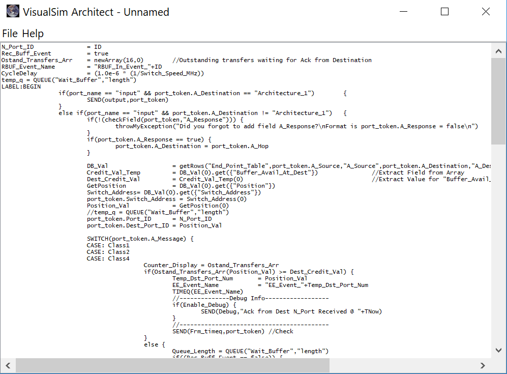 This block is used to write scripts and a set of blocks that use a C-like programming format to describe the logic or behaviors. The three supporting blocks are Smart_Controller, Script block, and Virtual_Machine_Untimed. The block can be used anywhere that detailed programming would be more suitable than using multiple blocks. This block can contain all the RegEx functions and contains standard C functions such as if, else-if, else, while, and SWITCH/CASE. RegEx algorithms can be created to perform decoding, loops, blocking waits, non-blocking waits, or execution based on input transactions, or model level variable. Input or Output ports can be added for additional functionality or virtual transactions can be sent, without ports or wires, into or out of the Script block. Event or time-based queues can be declared inside the Script. The Script block accepts data structures on the input ports, processes a sequence of C-like code, and outputs a data structure. The data structure can arrive at the ports or via virtual connections to the block. All the data structures are placed in a single non-priority input queue in the order of arrival. The data structures are executed in the order of arrival. The executions are requests using SEND to LABEL within the block and events being sent to this block. In the code, the currently executing data structure is named “port_token”. The arriving data structure can be associated with an arriving port, SystemResource (return from SystemResource) or “virtual” (virtual connection, and “event” (user event). The sequence of code can utilize the incoming data structures field, variable (local, global and variable-defined inside this block), RegEx language and parameter values. Using the RegEx functions, this block can send the Data Structures to Virtual Connection, SystemResources and other Script blocks.