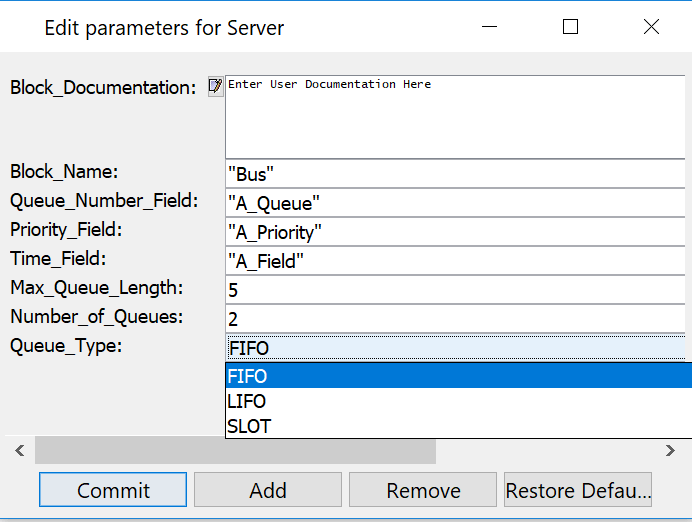 The Server emulates an active resource in the transaction flow. When the transaction reaches the head of the Queue, it has a fixed delay before being dequeued. The Queue portion is similar to the above Queue Resource.
