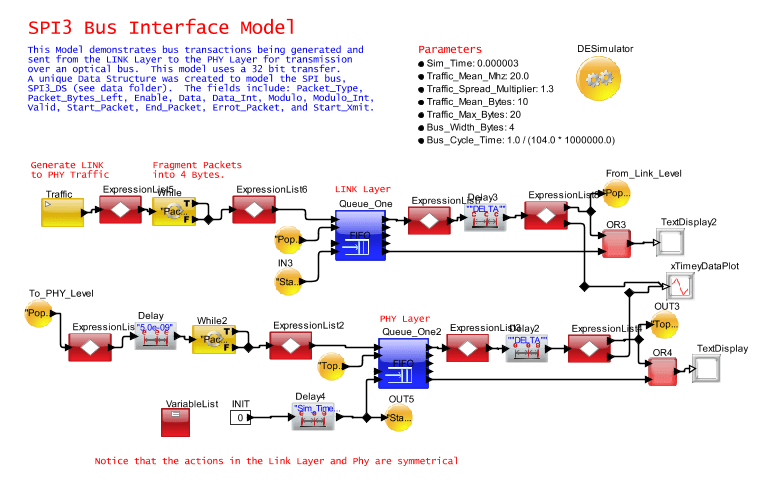 VisualSim Serial Peripheral Interface Bus (SPI) 3.0 bus library provides the first system-level modelling environment for assembling the port-to-port simulation of networking equipment. The SPI interface contains the data and MAC layers of the protocol, constructed at the signal level with accurate timing and data transfer. The blocks of this library can be connected with other networking and hardware architecture components to form the full system. Standard reports generated include a timing diagram showing the saw-tooth behaviours, number of I/O, and effective data rate. The library can also be used to develop extensions to the protocol for definition of future generation architectures.